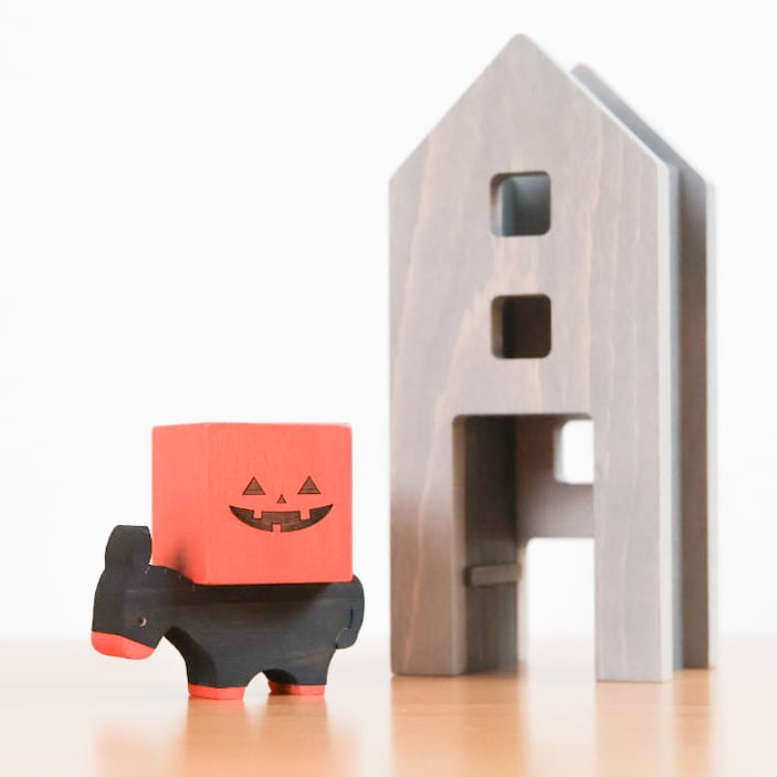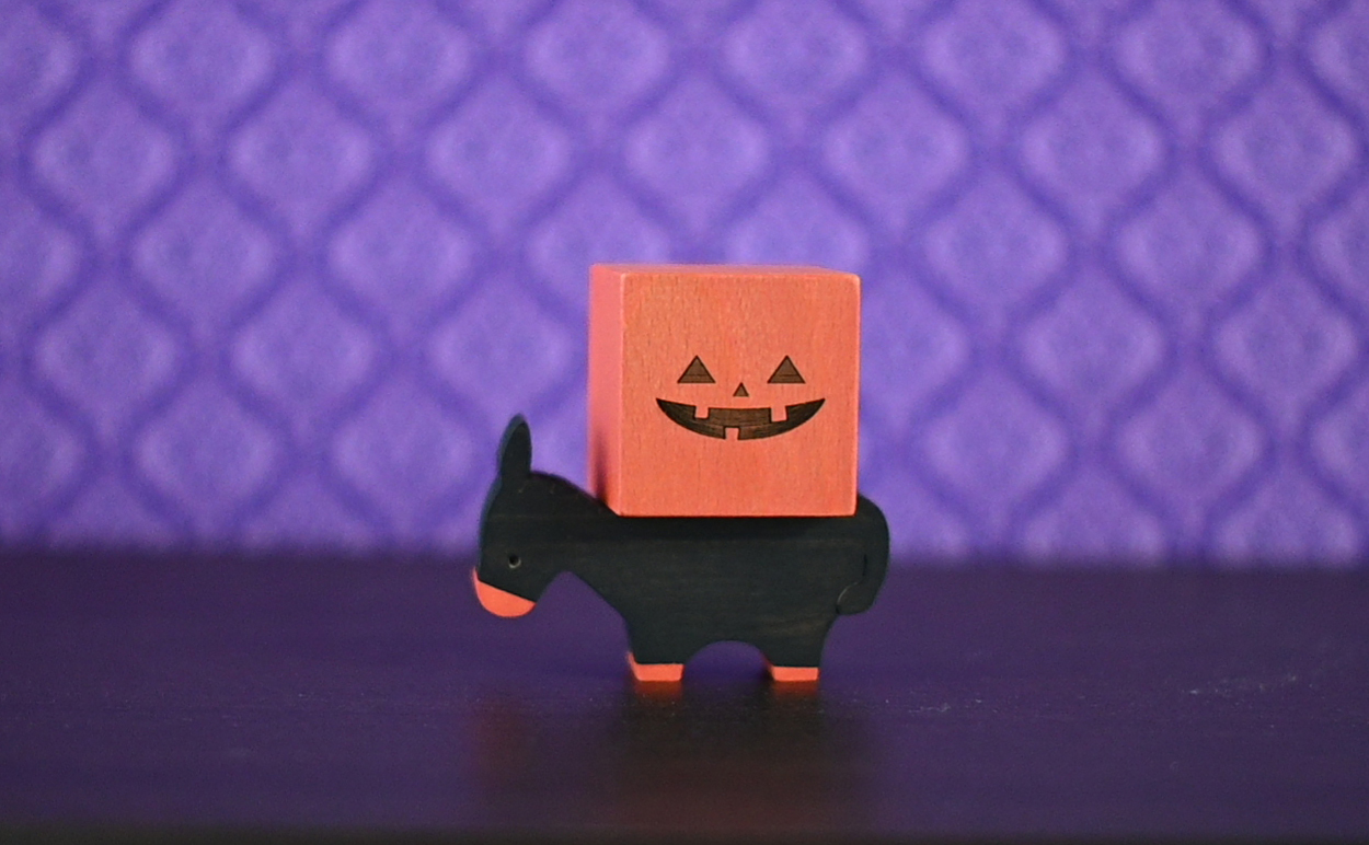 カボチャの積木を背負ったロバのおもちゃ、限定アイテム「ろばにぃ・ハロウィーン」です。積荷の入った車庫にロバをうしろから入れます。奥まで入ってから引っ張り出すと、ロバの背中に積荷が積まれています。車庫の積木が空っぽになったら、また上から積荷を入れて・・ロバを入れて・・引っ張り出して・・と繰り返し遊べるようになります。