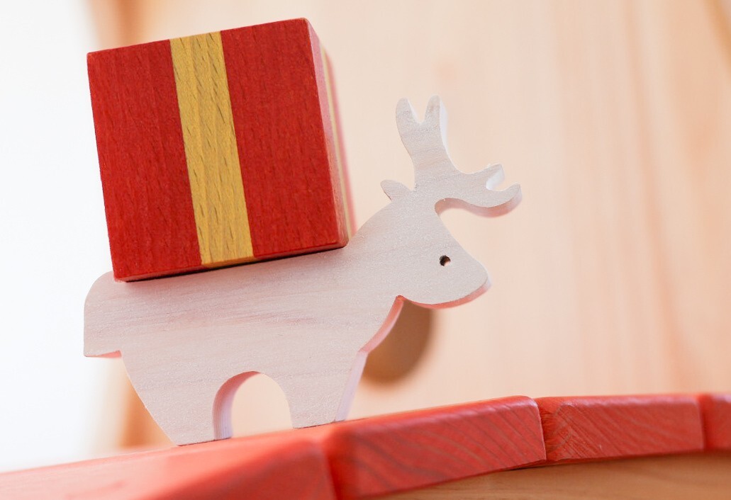 プレゼント積木を背負ったトナカイのおもちゃ、限定アイテム「となかいにぃ」です。積荷の入った車庫にトナカイをうしろから入れます。奥まで入ってから引っ張り出すと、トナカイの背中に積荷が積まれています。車庫の積木が空っぽになったら、また上から積荷を入れて・・トナカイを入れて・・引っ張り出して・・と繰り返し遊べるようになります。