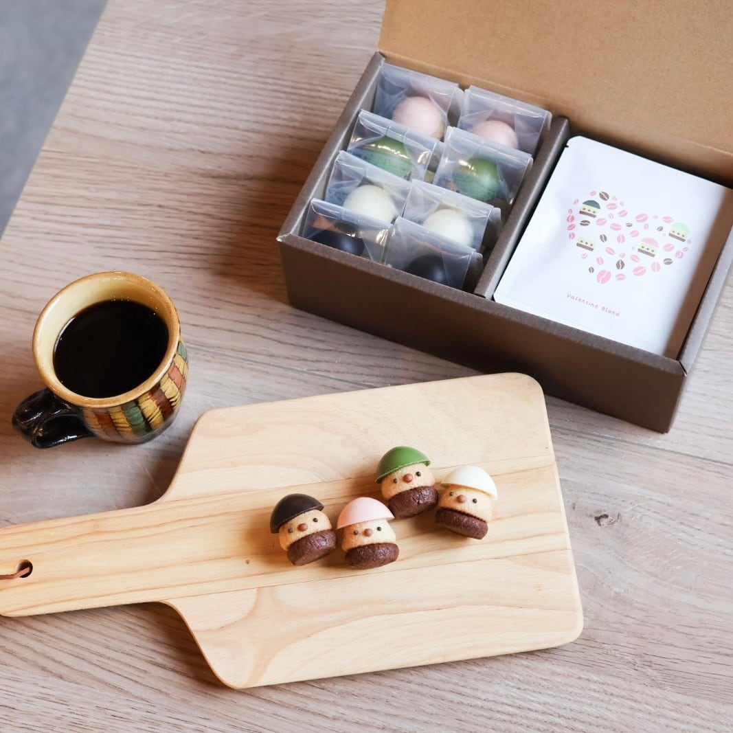 バレンタイン限定。チョコくっきーとコーヒーのセットです。どんぐりころころを模した、こまむぐのオリジナル「どんぐりチョコくっきー」。ココアとプレーンで作られた、無添加の美味しいクッキーにチョコレートの帽子を被った可愛いお菓子。チョコレートはダーク・ホワイト・いちご・抹茶の4種類。