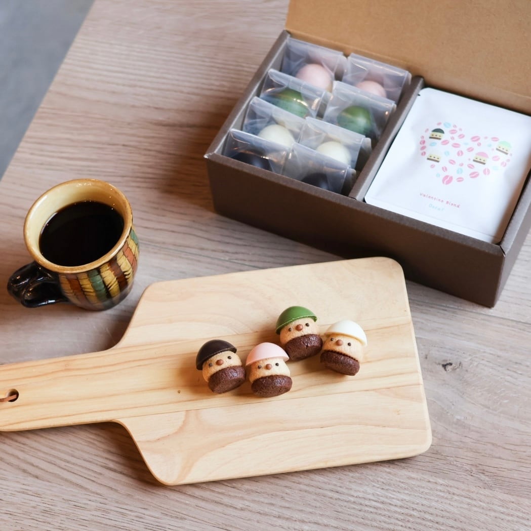 バレンタイン限定。チョコくっきーとコーヒーのセットです。どんぐりころころを模した、こまむぐのオリジナル「どんぐりチョコくっきー」。ココアとプレーンで作られた、無添加の美味しいクッキーにチョコレートの帽子を被った可愛いお菓子。チョコレートはダーク・ホワイト・いちご・抹茶の4種類。