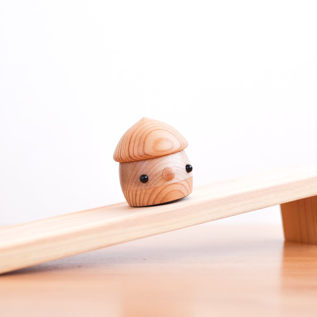坂道を可愛らしく歩くどんぐり帽子の木のおもちゃです。どんぐりころころを乗せた土台に少しだけ傾きをつけて坂道にしてあげると、トコトコと揺れながら可愛らしく坂を下っていきます。どんぐりを歩かせる坂道の素材は、板状であれば何でも大丈夫です。トレーやお盆や絵本などもご使用いただけます。