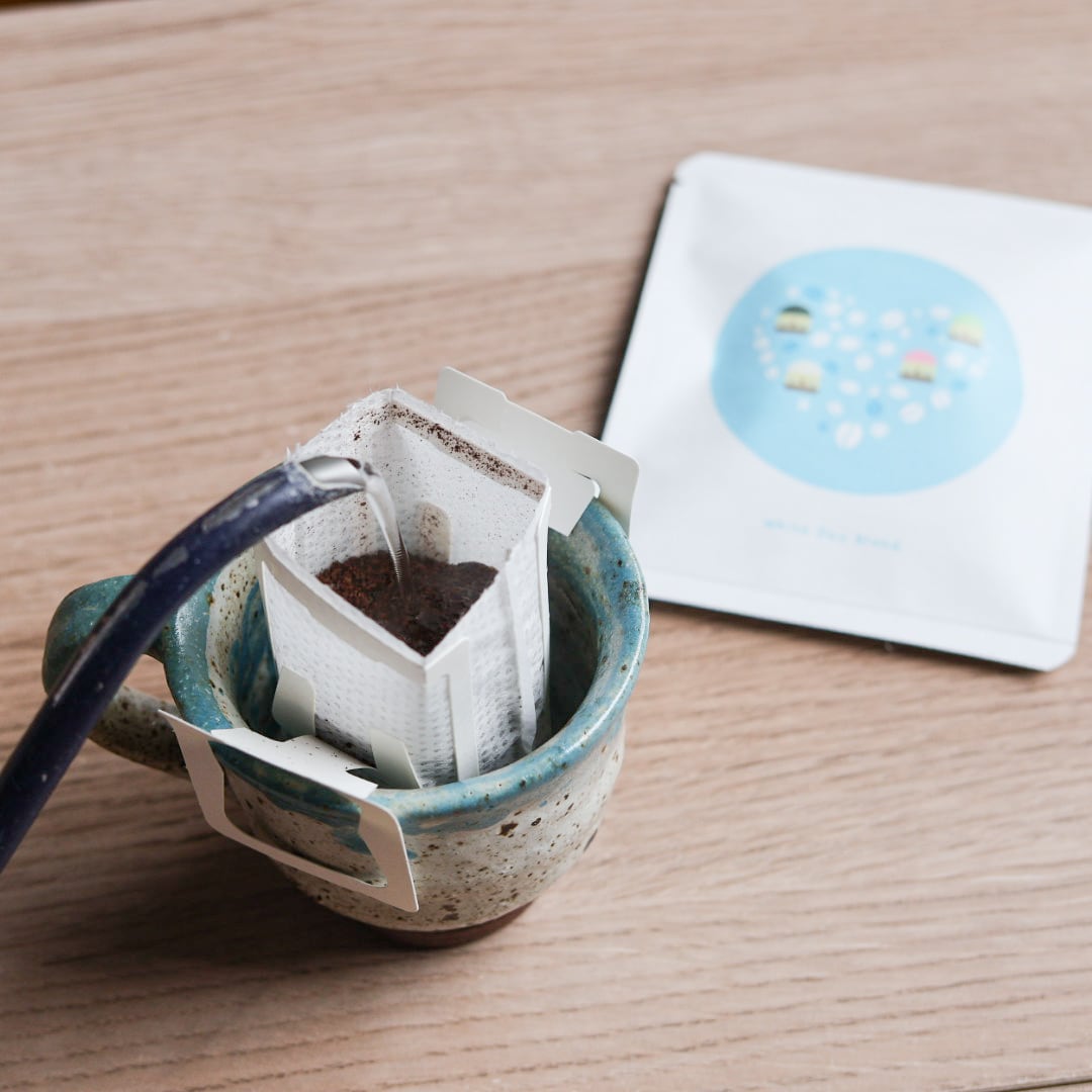 コーヒーもこまむぐで焙煎をした新鮮で香り豊かなコーヒーをドリップバッグにしました。ホワイトデー限定のかわいらしいパッケージに入っています。