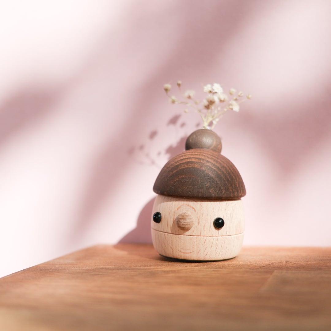 おだんご頭のどんぐりままが一輪挿しになりました。お部屋を彩る遊び心あふれる一輪挿しです。ご自宅用に、また母の日の贈り物やプレゼントにも最適。シルクハットが特徴的な【どんぐりぱぱ】とセットでお求めもおススメです。