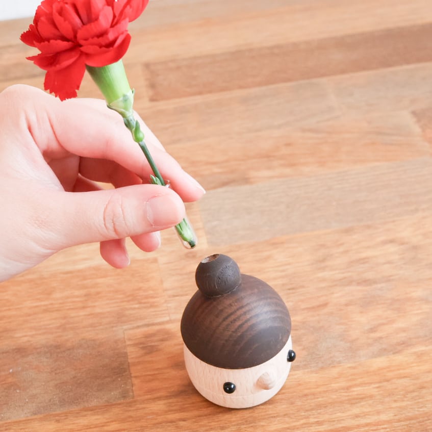 どんぐりままの一輪挿しは、木のおもちゃ【どんぐりころころシリーズ】と同様、なだらかな傾斜に置くとカタカタと動かすことができます。坂で動かす用途でご利用の際には、ガラス製の試験管が破損しないよう、落下・転倒しないようご注意ください。また試験管の中に水が入った状態では坂で動かす用途でのご利用はご遠慮ください。