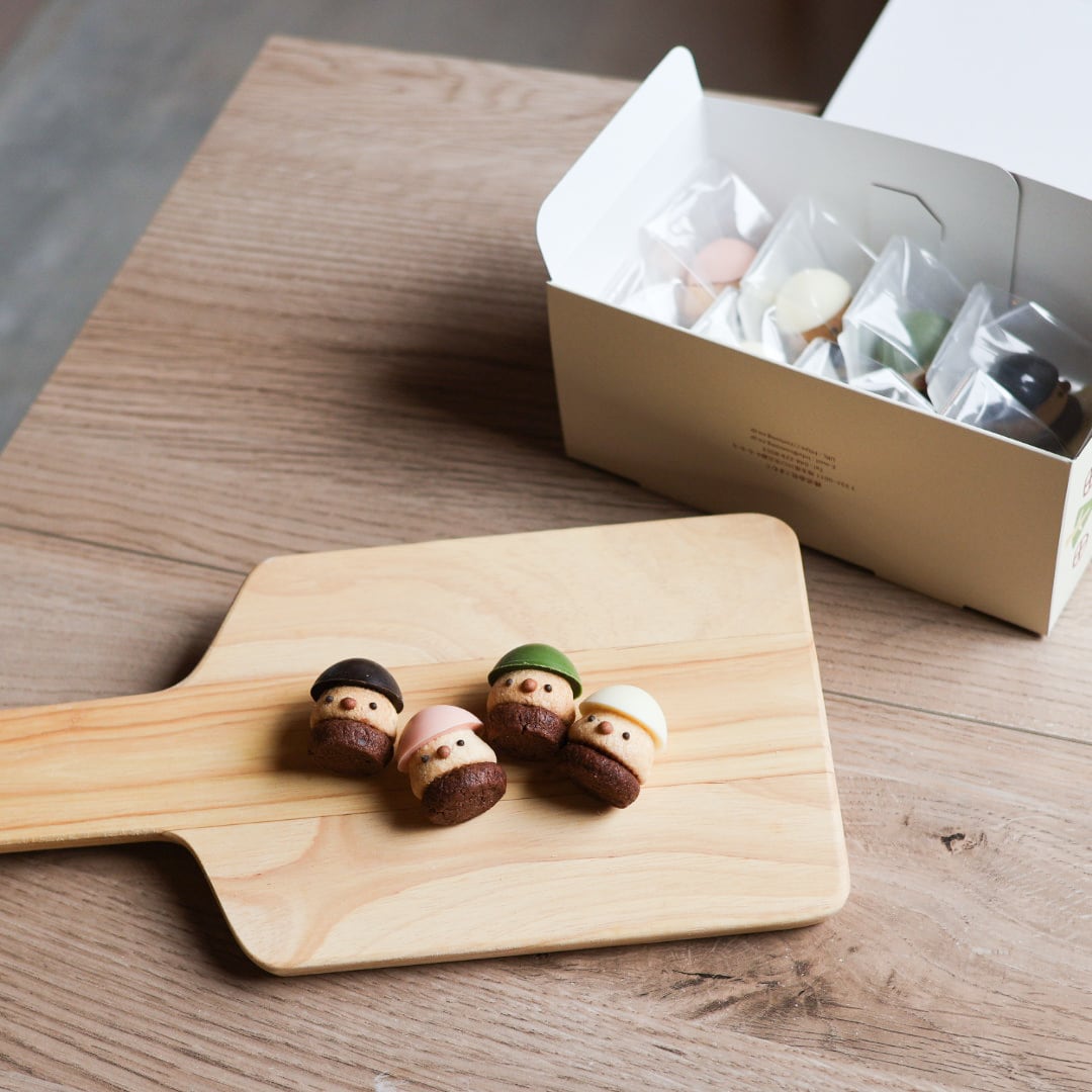 どんぐりころころを模した、こまむぐのオリジナル「どんぐりチョコくっきー」。ココアとプレーンで作られた、無添加の美味しいクッキーにチョコレートの帽子を被った可愛いお菓子。チョコレートはダーク・ホワイト・いちご・抹茶の4種類。かわいらしいパッケージに入ってお届け。ご自宅用にも、贈り物にも最適です。